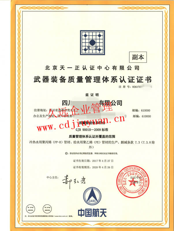 武器裝備質(zhì)量管理體系認(rèn)證證書